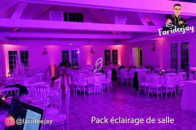 Farideejay propose plusieurs packs personnalisés, comme le Pack slow des mariés avec fumée lourde et artifices, ou le Pack éclairage de salle pour une ambiance colorée. Chaque prestation est ajustée selon les préférences des clients.