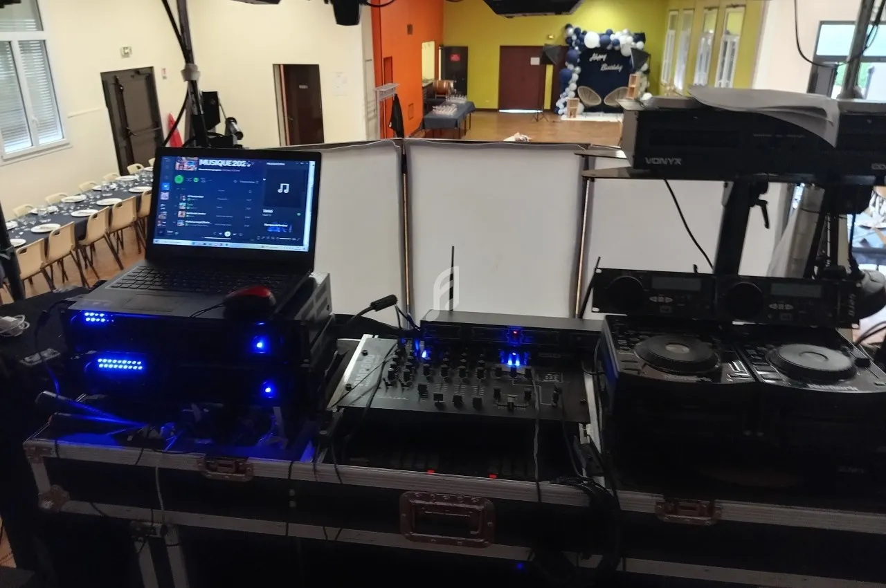 Bonjour, je suis un DJ avec un équipement de qualité comprenant un portique avec lumières, une machine à fumée et bulles, 3 tables de mixage, 5 enceintes, 2 ordinateurs, 4 platines CD, 1 vidéoprojecteur et écran, 3 amplificateurs de 2000 watts, 1 contrôleur, 1 mushroom, 1 laser, 3 néons lumineux, 2 stroboscopes, 3 micros sans fil et filaires, 1 rideau lumineux, 4 lampes de piste, 3 boules à facette, 1 boule lumineuse, 2 machines à bulles.