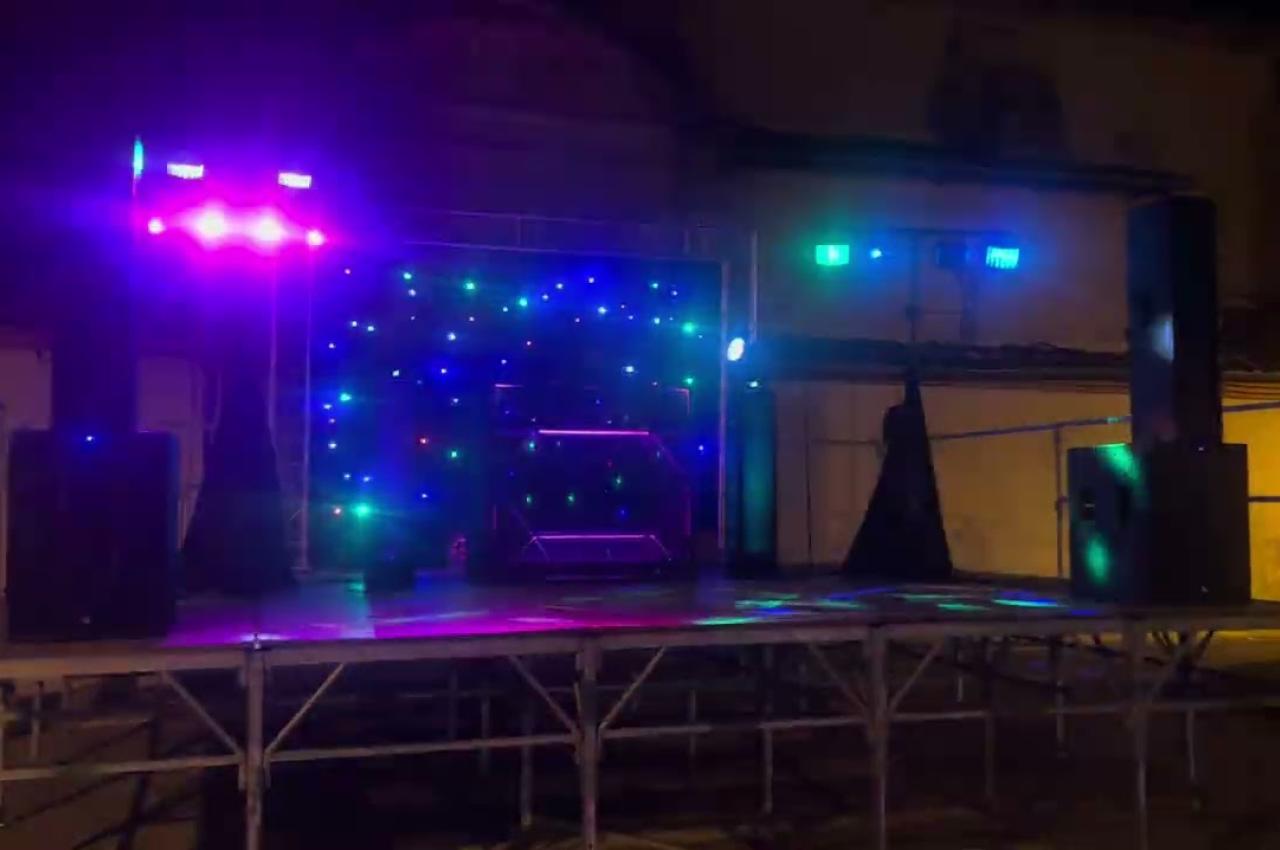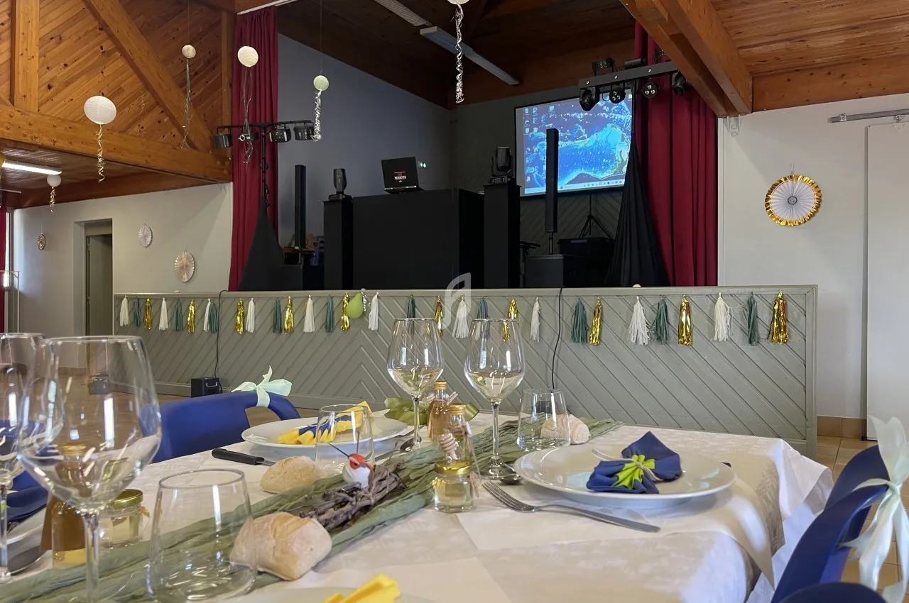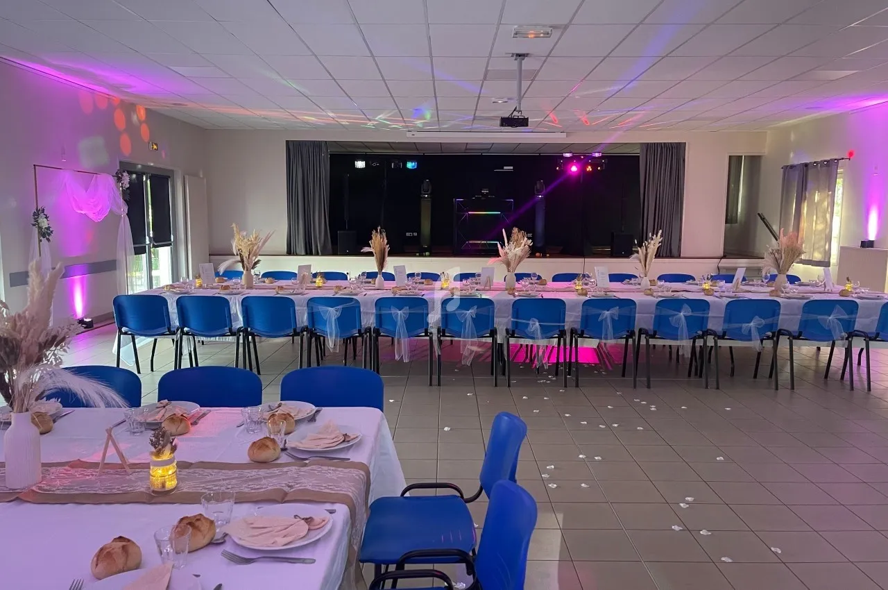 Sono + lumières + micros + machine à étincelles, à fumée lourde, à brouillard + éclairage mural + écran et vidéo projecteur.