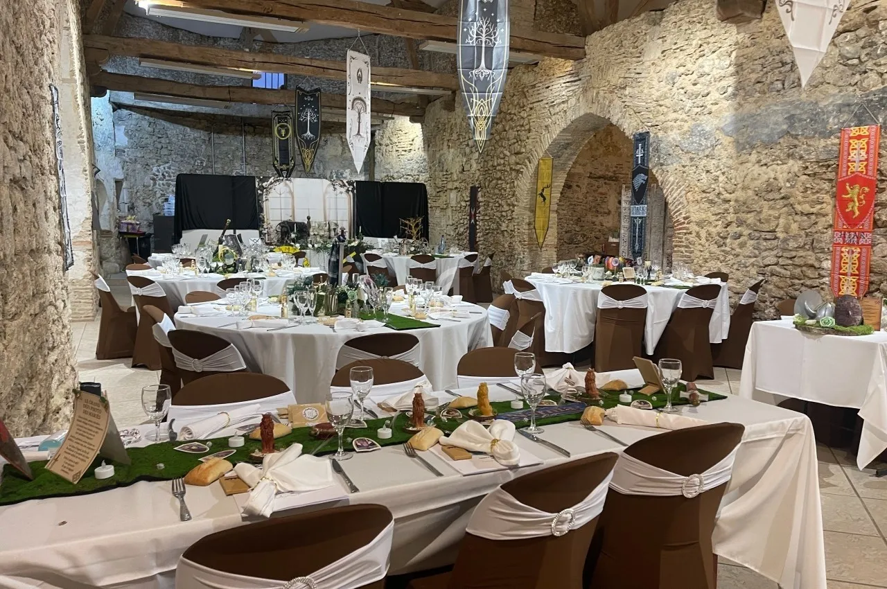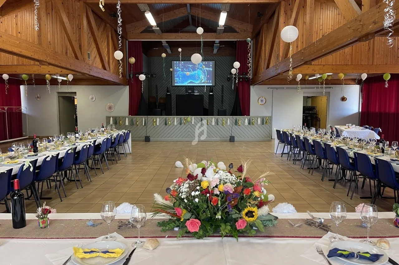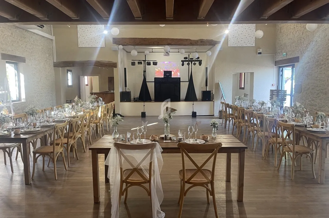 Sono + lumières + micros + machine à étincelles, à fumée lourde, à brouillard + éclairage mural + écran et vidéo projecteur.